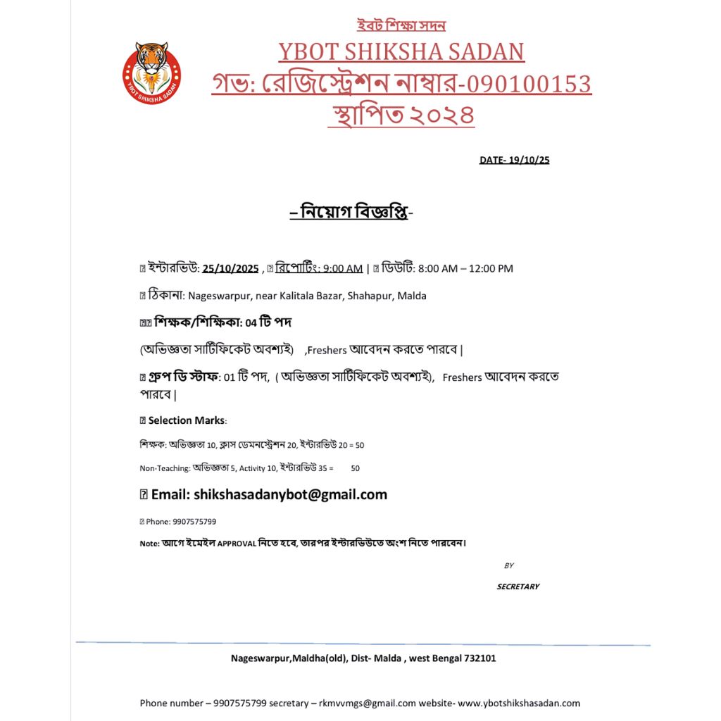 শিক্ষক ও গ্রুপ ডি স্টাফ নিয়োগ বিজ্ঞপ্তি